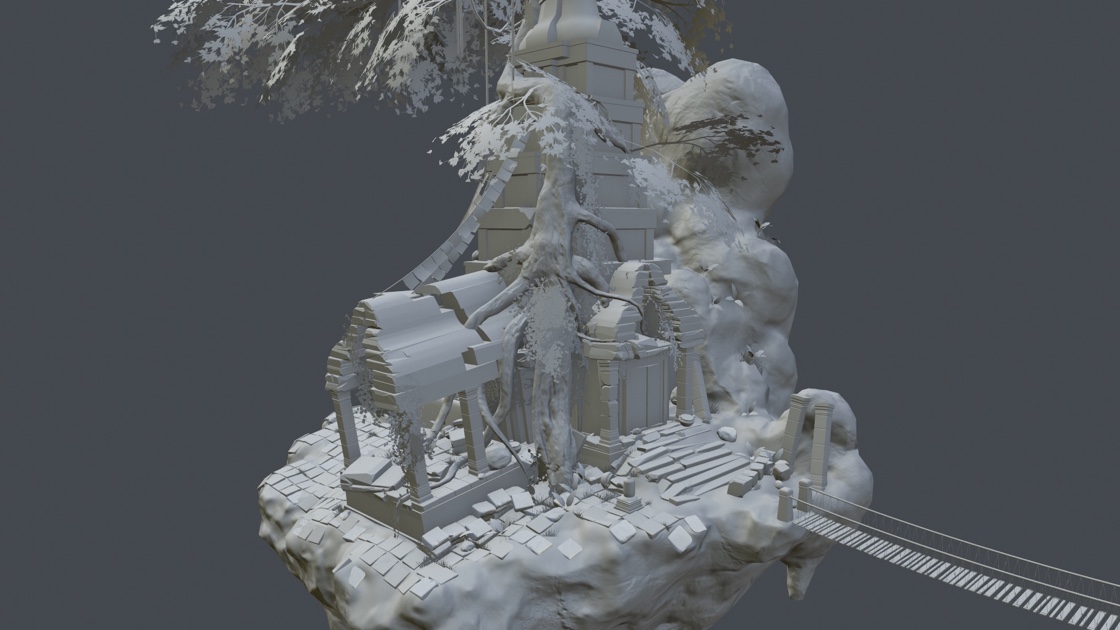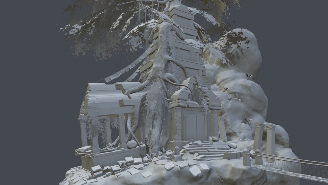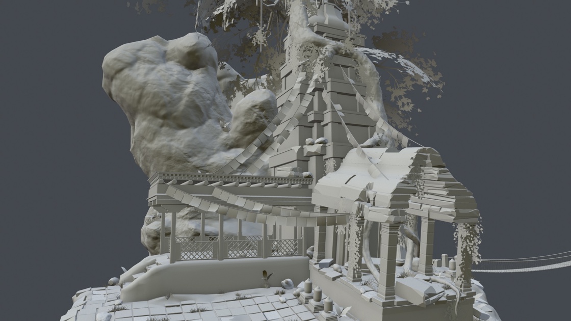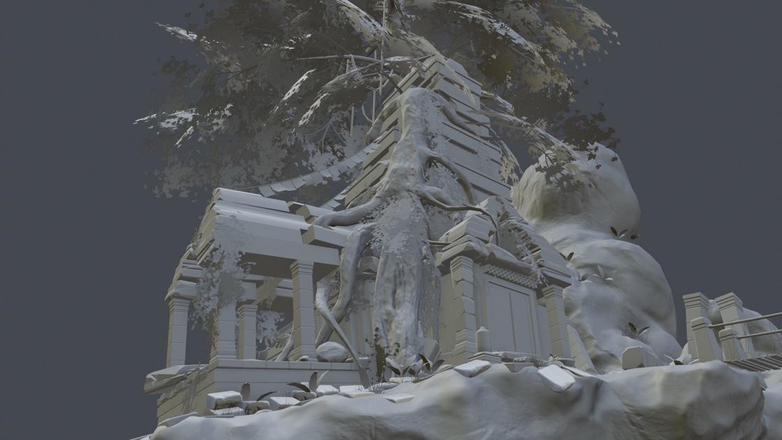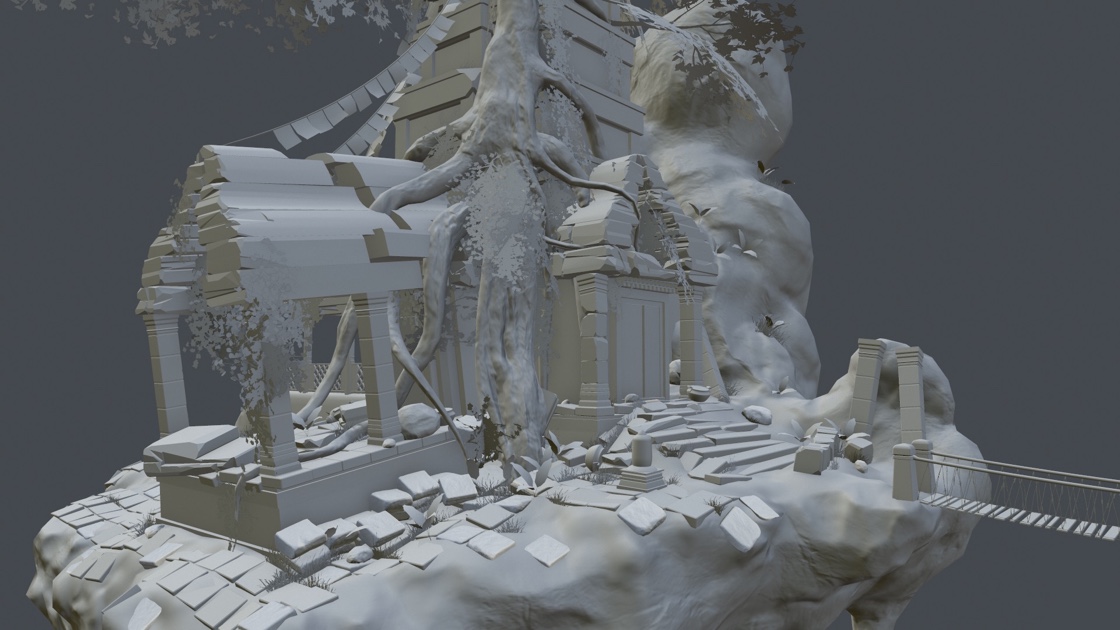 The ruins of a long lost jungle temple. Most of the model was created in Maya, with detail added in with ZBrush.